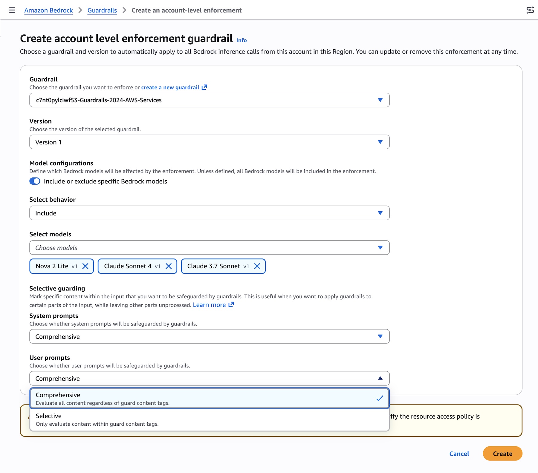 You can choose the guardrail and version to automatically apply to all Bedrock inference calls from this account in this Region. With general availability, we introduce the new feature defining which models will be affected by the enforcement with either Include or Exclude behavior.