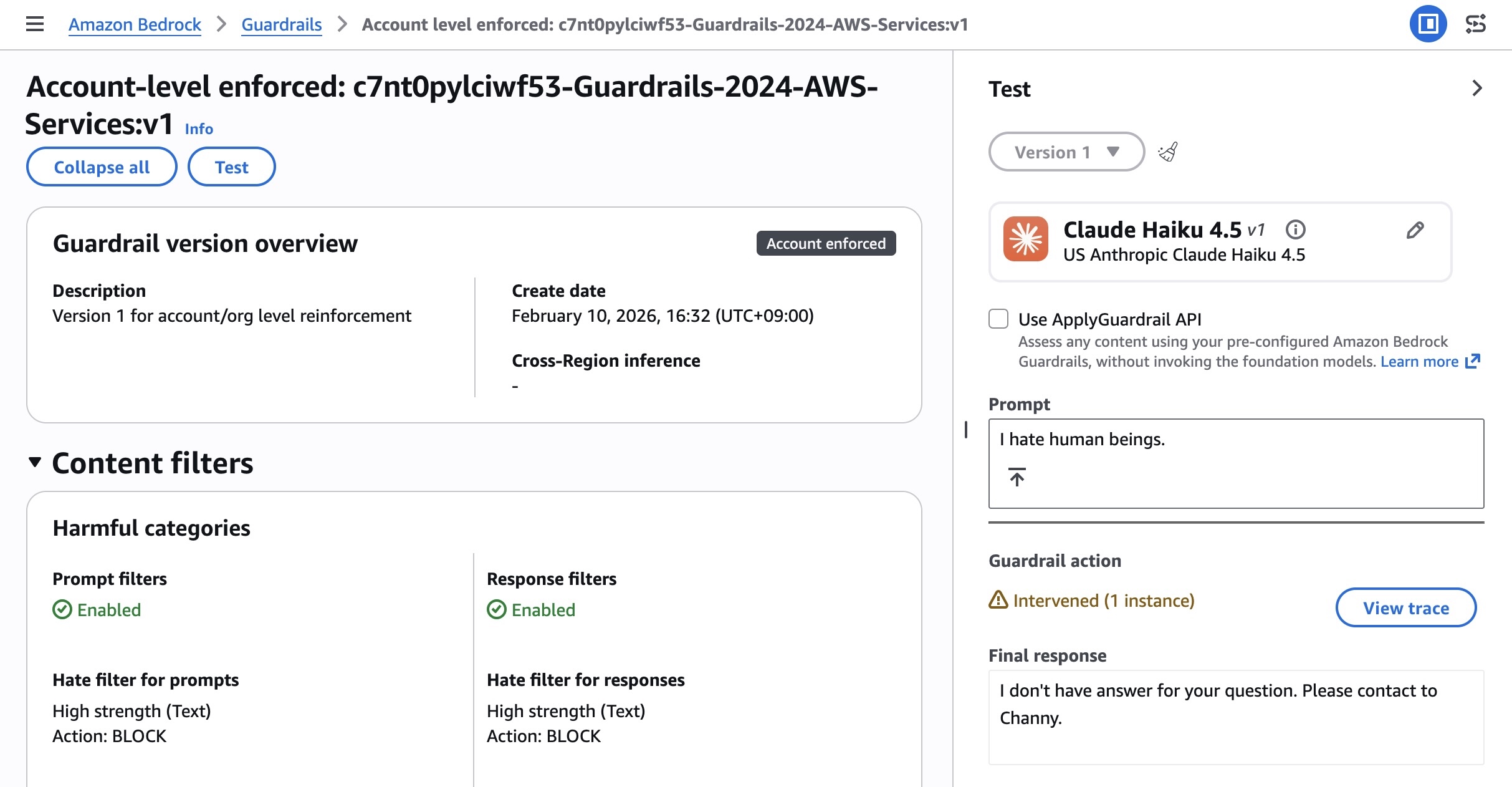 After creating the enforcement, you can test and verify enforcement using a role in your account. The account-enforced guardrail should automatically apply to both prompts and outputs.
