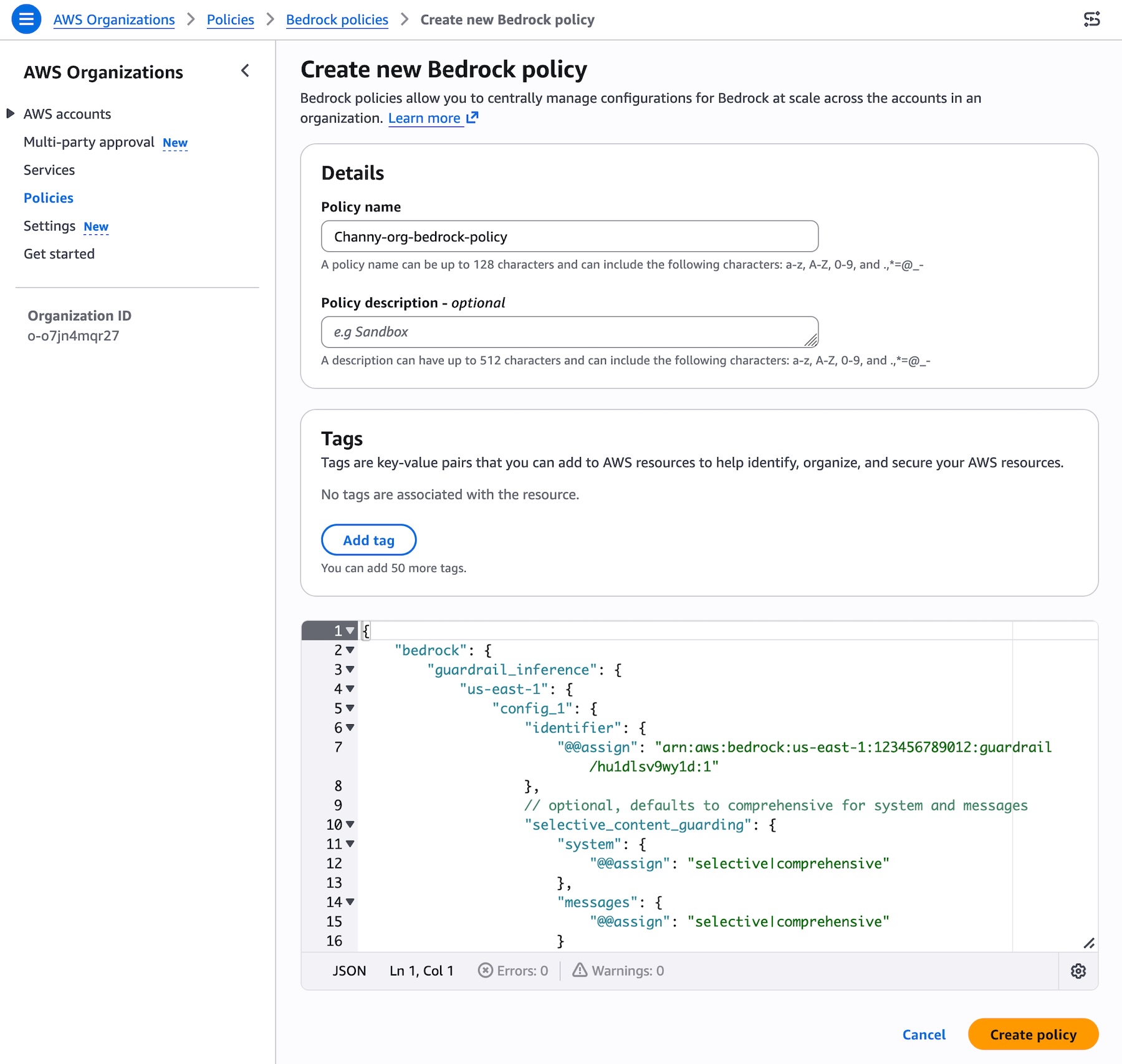 You can create a Bedrock policy that specifies your guardrail and attach it to your target accounts or OUs. Choose Bedrock policies enabled and Create policy. Specify your guardrail ARN and version and configure the input tags setting for in the AWS Organizations. To learn more, visit Amazon Bedrock policies in AWS Organizations and Amazon Bedrock policy syntax and examples.