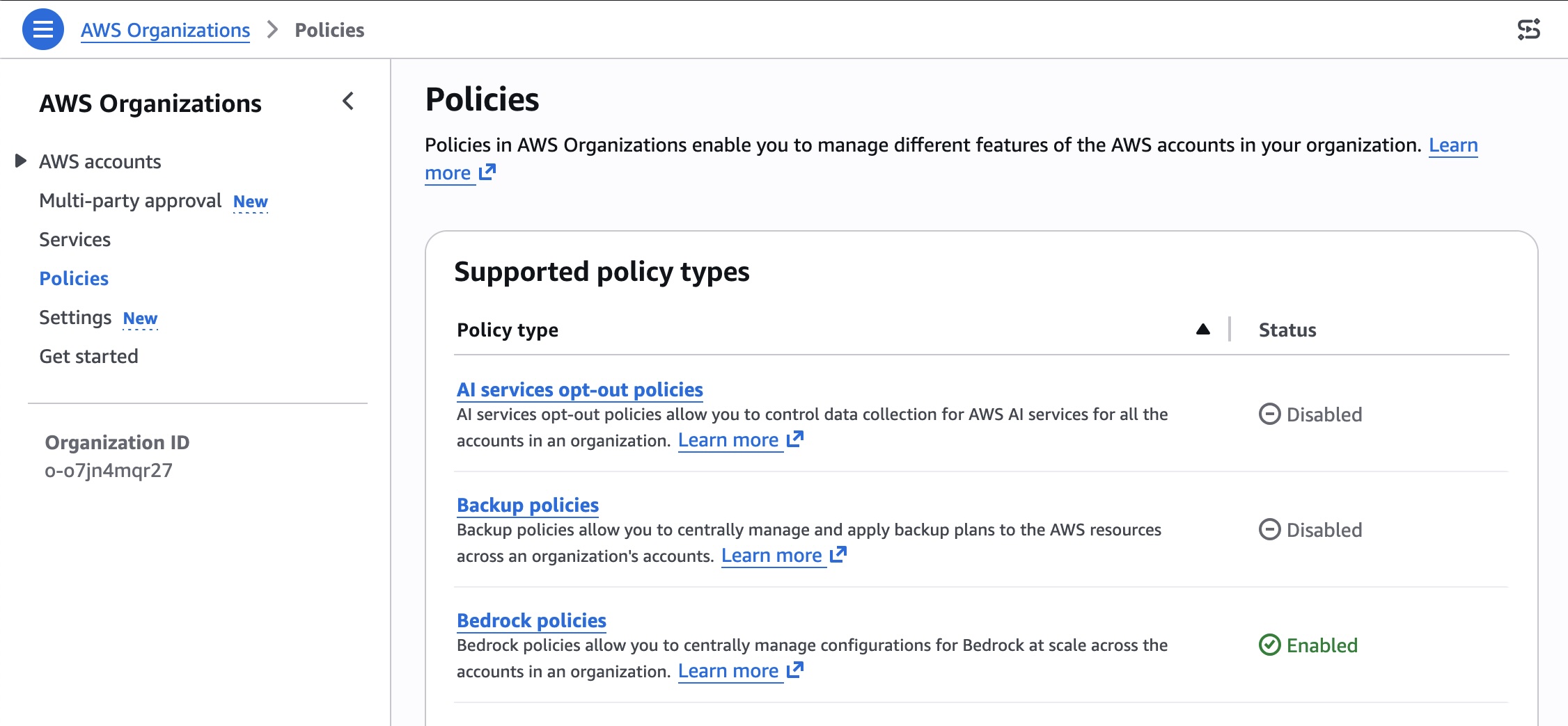 To enable organization-level enforcement, go to AWS Organizations console and choose Policies menu. You can enable the Bedrock policies in the console.