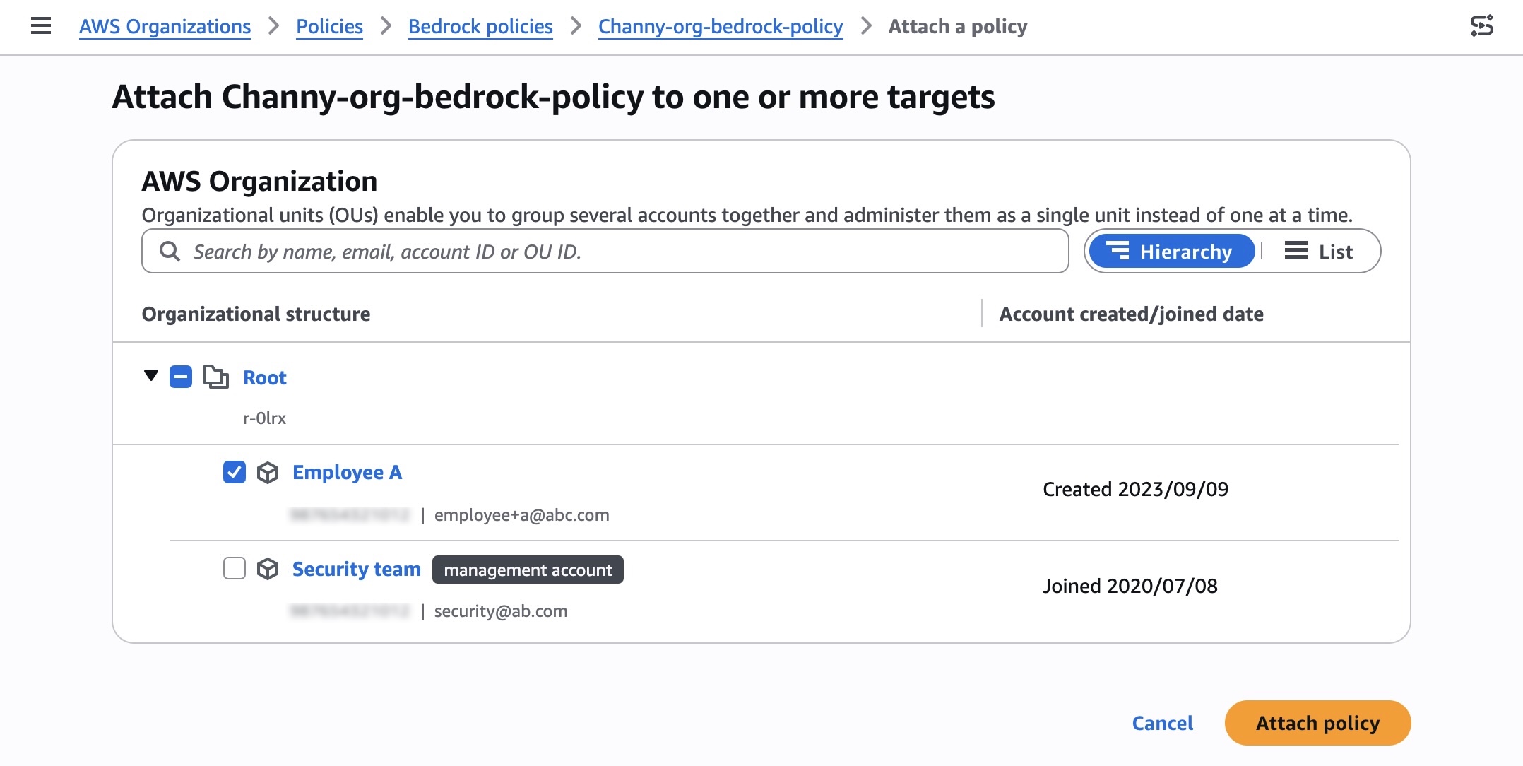 Search and select your organization root, OUs, or individual accounts to attach your policy, and choose Attach policy.