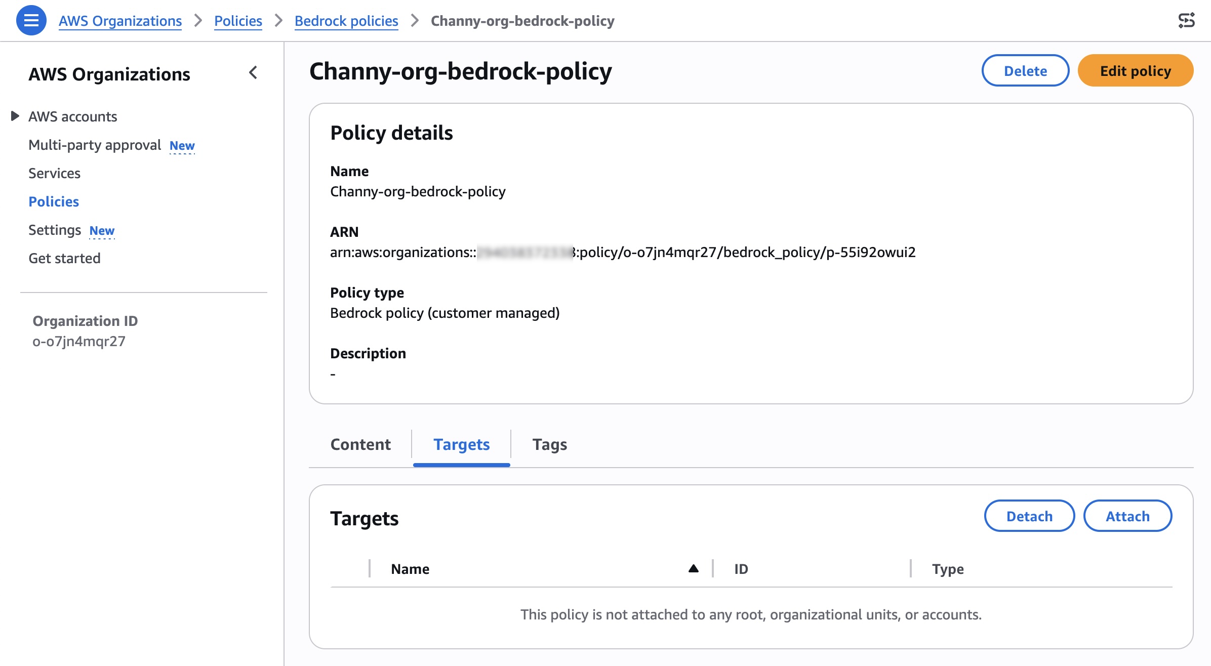After creating the policy, you can attach the policy to your desired organizational units, accounts, root in the Targets tab.