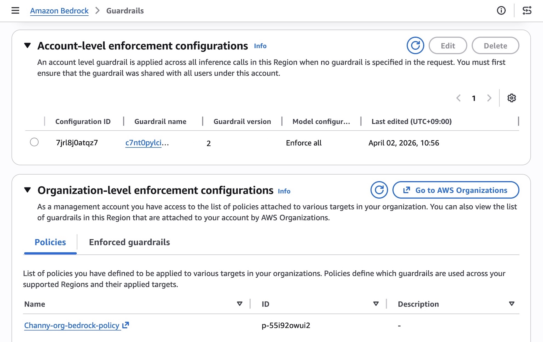 - Account-level enforcement enables automatic enforcement of configured safeguards across all Amazon Bedrock model invocations in your AWS account. The configured safeguards in the account-level guardrail apply to all inference API calls.