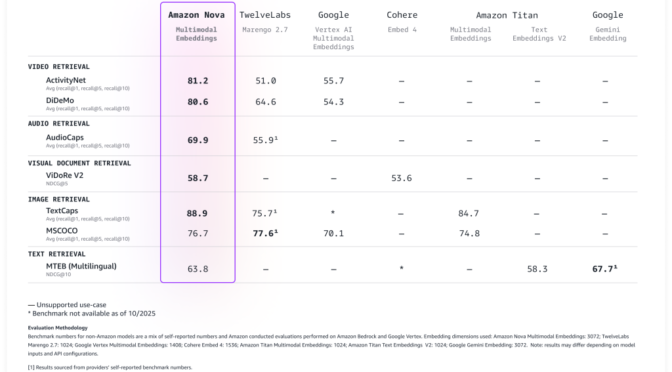 Nova Multimodal Embeddings supports a context length of up to 8K tokens, text in up to 200 languages, and accepts inputs via synchronous and asynchronous APIs. Additionally, it supports segmentation (also known as “chunking”) to partition long-form text, video, or audio content into manageable segments, generating embeddings for each portion. Lastly, the model offers four output embedding dimensions, trained using Matryoshka Representation Learning (MRL) that enables low-latency end-to-end retrieval with minimal accuracy changes.