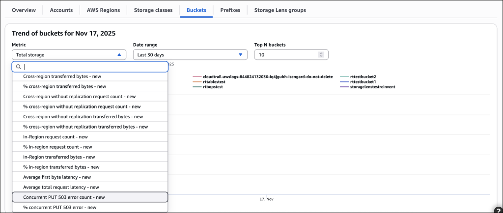 After it’s enabled, I’ll receive daily performance metrics directly in the Storage Lens console dashboard. You can also choose to export report in CSV or Parquet format to any bucket in your account or publish to Amazon CloudWatch. The performance metrics are aggregated and published daily and will be available at multiple levels: organization, account, bucket, and prefix. In this dropdown menu, I choose the % concurrent PUT 503 error for the Metric, Last 30 days for the Date range, and 10 for the Top N buckets.