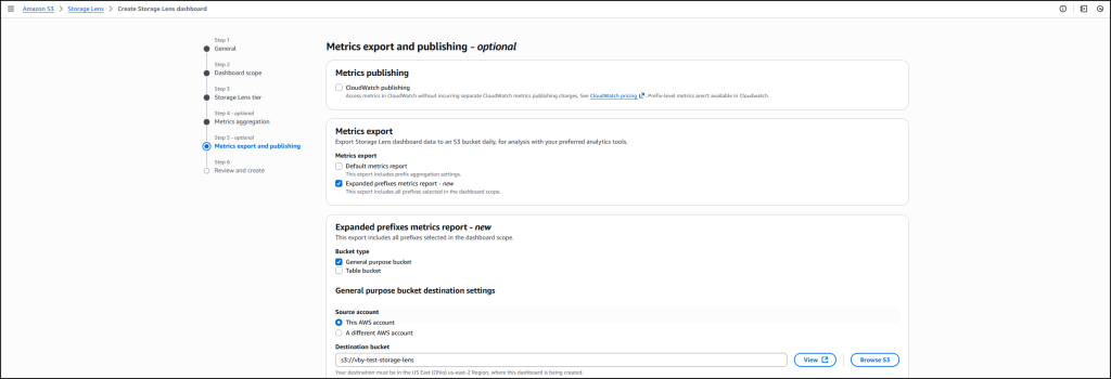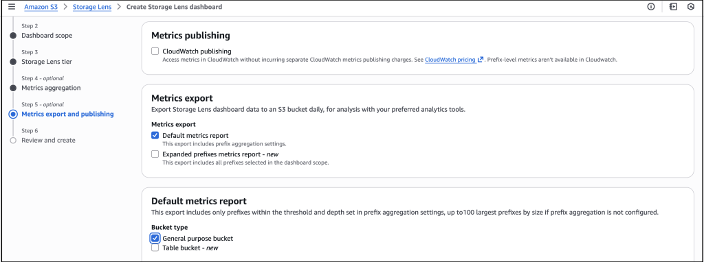 I start by following the process outlined in Step 5 on the console, where I choose the export destination. This time, I choose Expanded prefixes metrics report. In addition to General purpose bucket, I choose Table bucket.