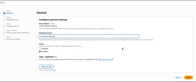 On the Amazon S3 console I choose Create Storage Lens dashboard to create a new dashboard. You can also edit an existing dashboard configuration. I then configure general settings such as providing a Dashboard name, Status, and the optional Tags. Then, I choose Next.
