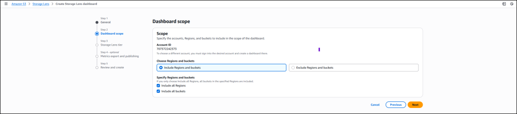 Next, I define the scope of the dashboard by selecting Include all Regions and Include all buckets and specifying the Regions and buckets to be included.