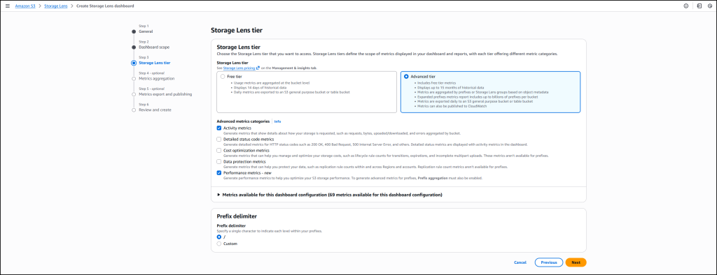 I opt in to the Advanced tier in the Storage Lens dashboard configuration, select Performance metrics, then choose Next.