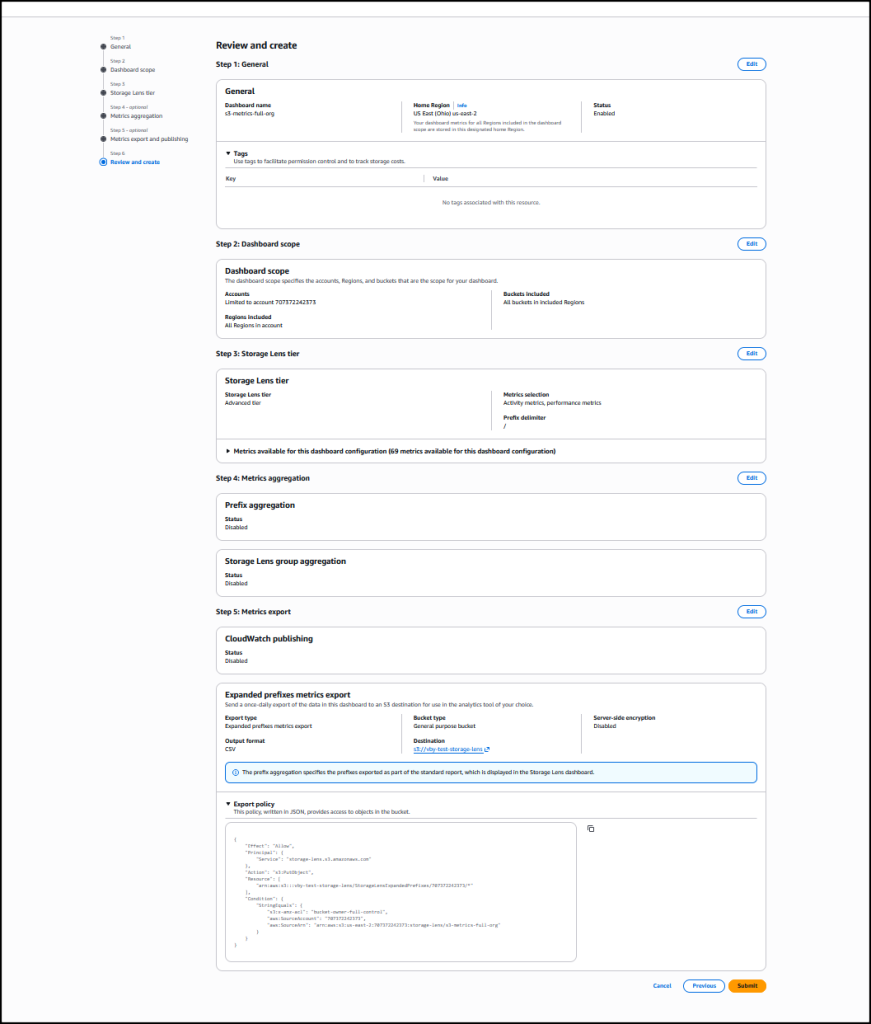I follow the same steps outlined in the How it works section to create or update the Storage Lens dashboard. In Step 4 on the console, where you select export options, you can select the new Expanded prefixes metrics report. Thereafter, I can export the expanded prefixes metrics report in CSV or Parquet format to any general purpose bucket in my account for efficient querying of my Storage Lens data.