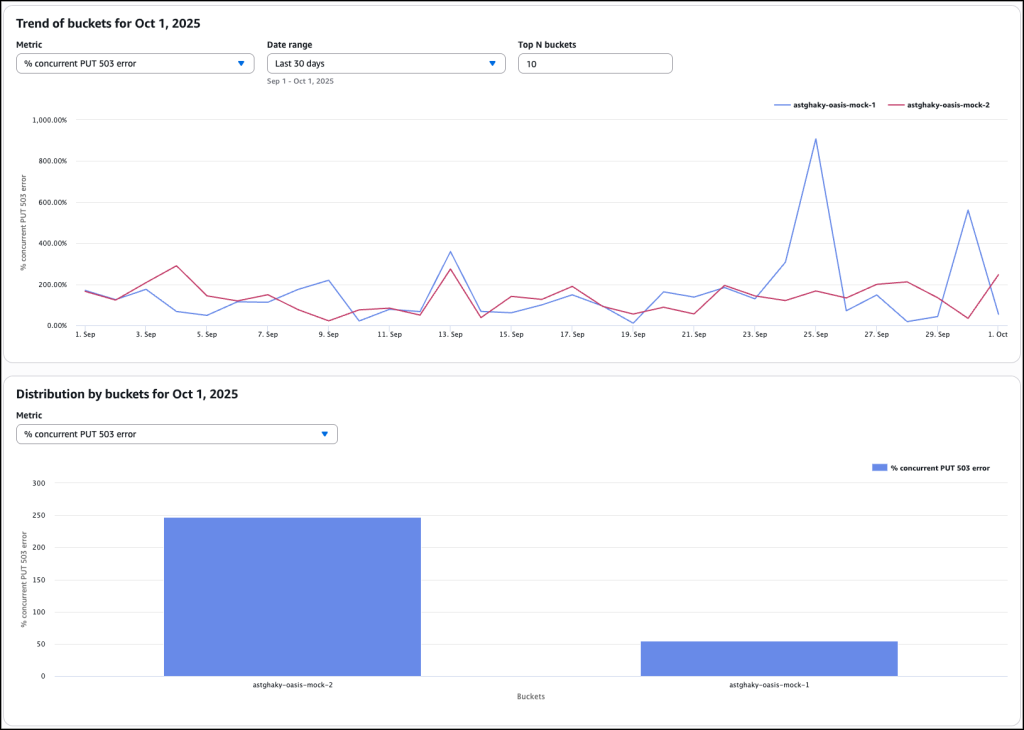 | Concurrent PUT 503 errors | Number of 503s due to concurrent PUT operation on same object | Identify prefixes with concurrent PUT throttling that slow down performance | For single writer, modify retry behavior or use Amazon S3 Express One Zone. For multiple writers, use consensus mechanism or use Amazon S3 Express One Zone |