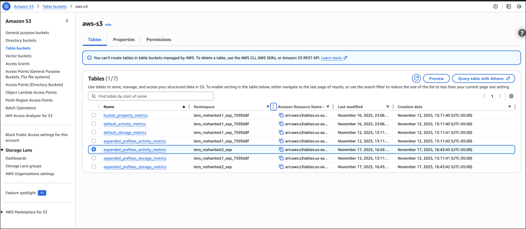 The new Storage Lens metrics are exported to new tables in an AWS managed bucket aws-s3.