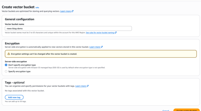 I also can add tags for the vector bucket and vector index. Tags at the vector index help with access control and cost allocation.