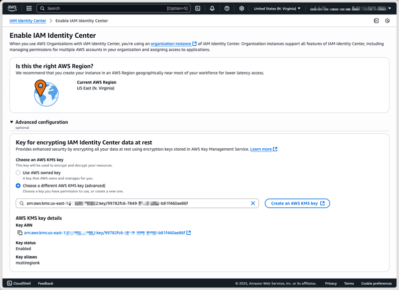 Identity Center supports both single-Region and multi-Region keys to match your deployment needs. While Identity Center instances can currently only be deployed in a single Region, we recommend using multi-Region AWS KMS keys unless your company policies restrict you to single-Region keys. Multi-Region keys provide consistent key material across Regions while maintaining independent key infrastructure in each Region. This gives you more flexibility in your encryption strategy and helps future-proof your deployment.