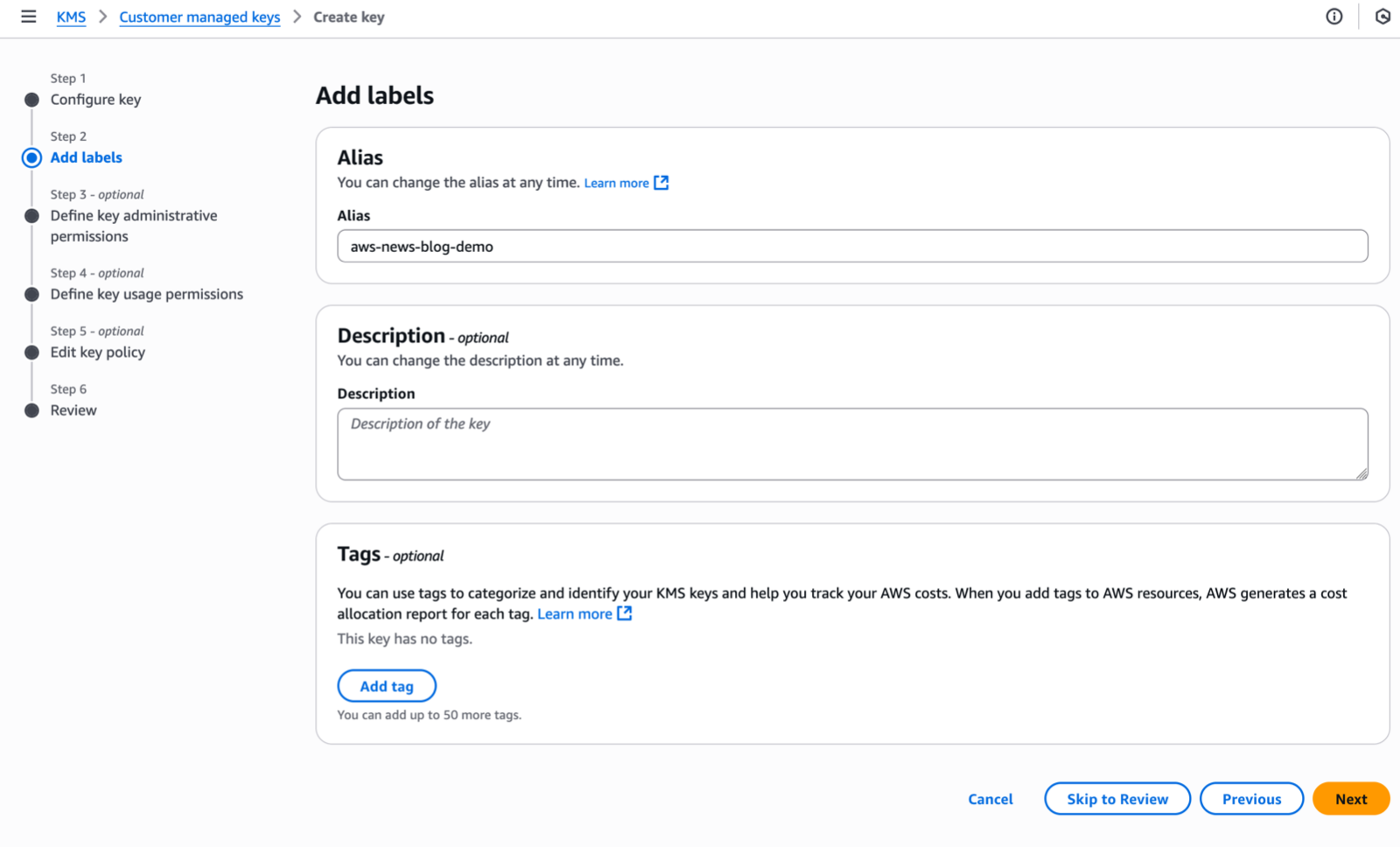 Under Step 2–Add Labels, I enter an Alias name for my key and select Next.