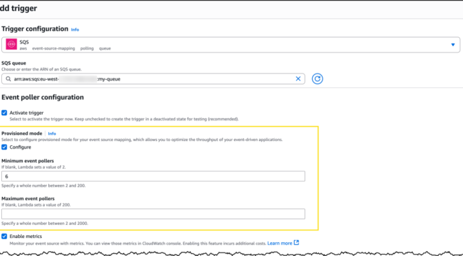 Enabling provisioned mode is straightforward in the AWS Management Console. You need to already have an SQS queue configured and a Lambda function. To get started, in the Configuration tab for your Lambda function, choose Triggers, then Add trigger. This will bring up a user interface where you can configure your trigger. Choose SQS from the dropdown menu for source and then select the SQS queue you want to use.