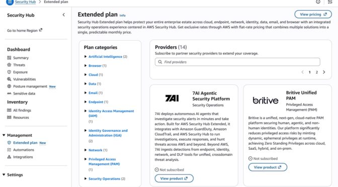 Today, we’re announcing AWS Security Hub Extended, a plan of Security Hub that simplifies how you procure, deploy, and integrate a full-stack enterprise security solution across endpoint, identity, email, network, data, browser, cloud, AI, and security operations. With the Extended plan, you can expand your security portfolio beyond AWS to help protect your enterprise estate through a curated selection of AWS Partner solutions, including 7AI, Britive, CrowdStrike, Cyera, Island, Noma, Okta, Oligo, Opti, Proofpoint, SailPoint, Splunk, a Cisco company, Upwind, and Zscaler.