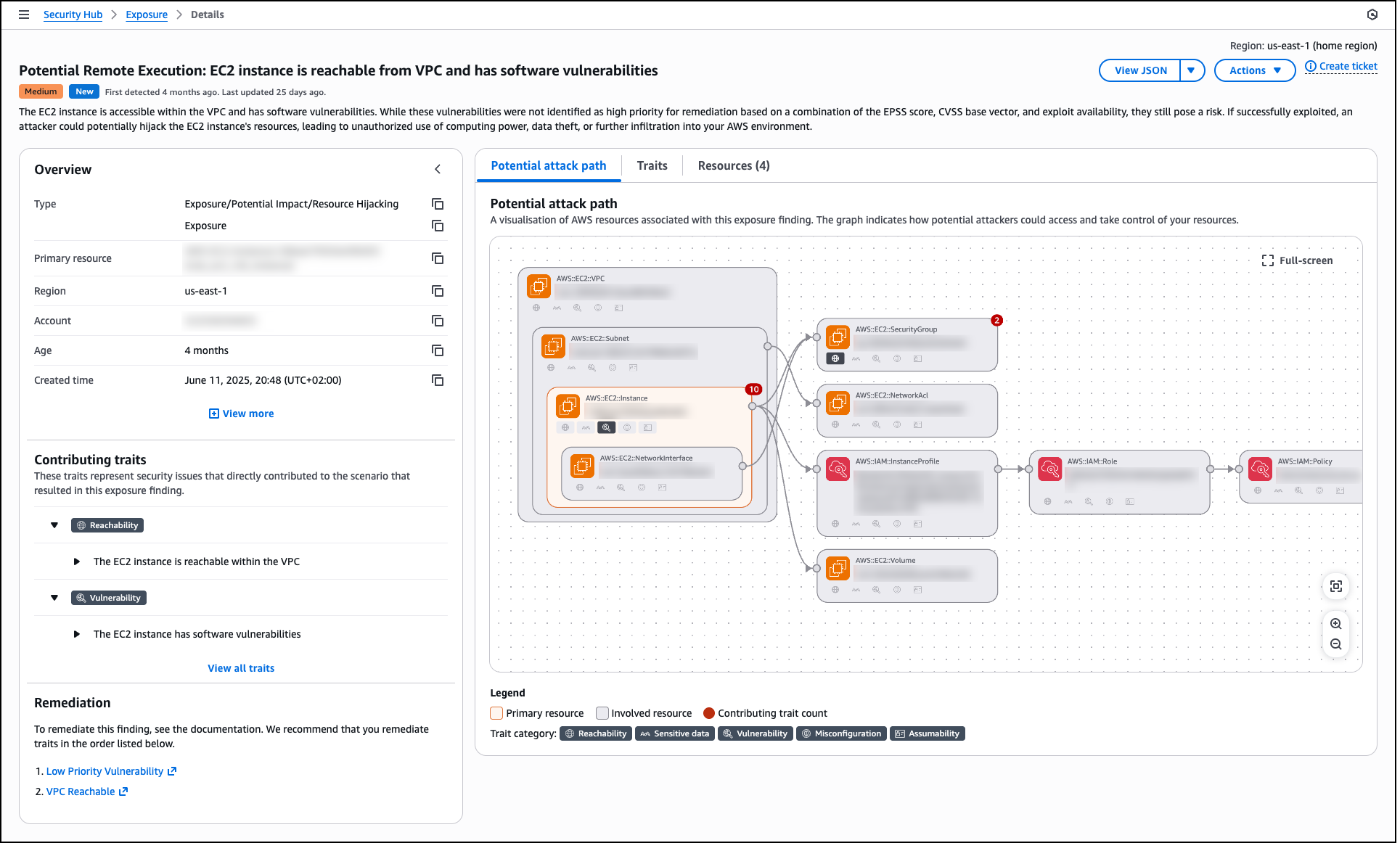 The details page includes a Potential attack path tab that provides a visual graph showing how potential attackers could access and take control of your resources. This visualization displays the relationships between the primary resource (such as an EC2 instance), involved resources (such as VPC, subnet, network interface, security group, AWS Identity and Access Management (IAM) instance profile, IAM role, IAM policy, and volumes), and contributing traits. The graph helps you understand the complete attack surface and identify which security controls need adjustment.