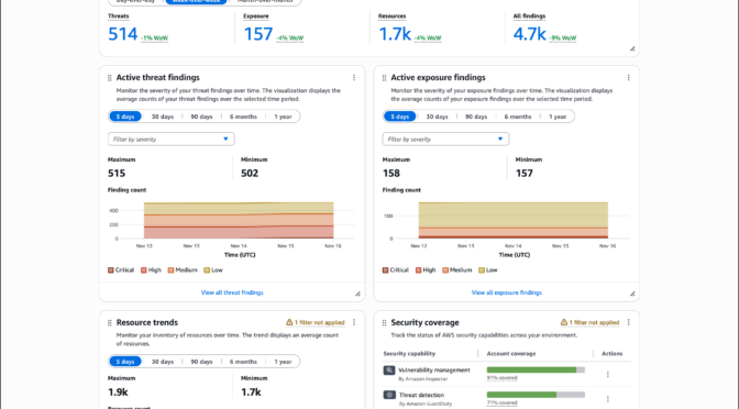 Security Hub includes a Trends feature through the Summary dashboard that provides up to 1 year of historical data for findings and resources across your organization. The Summary dashboard displays an overview of your exposures, threats, resources, and security coverage through customizable widgets that you can add, remove, and arrange based on your operational needs.