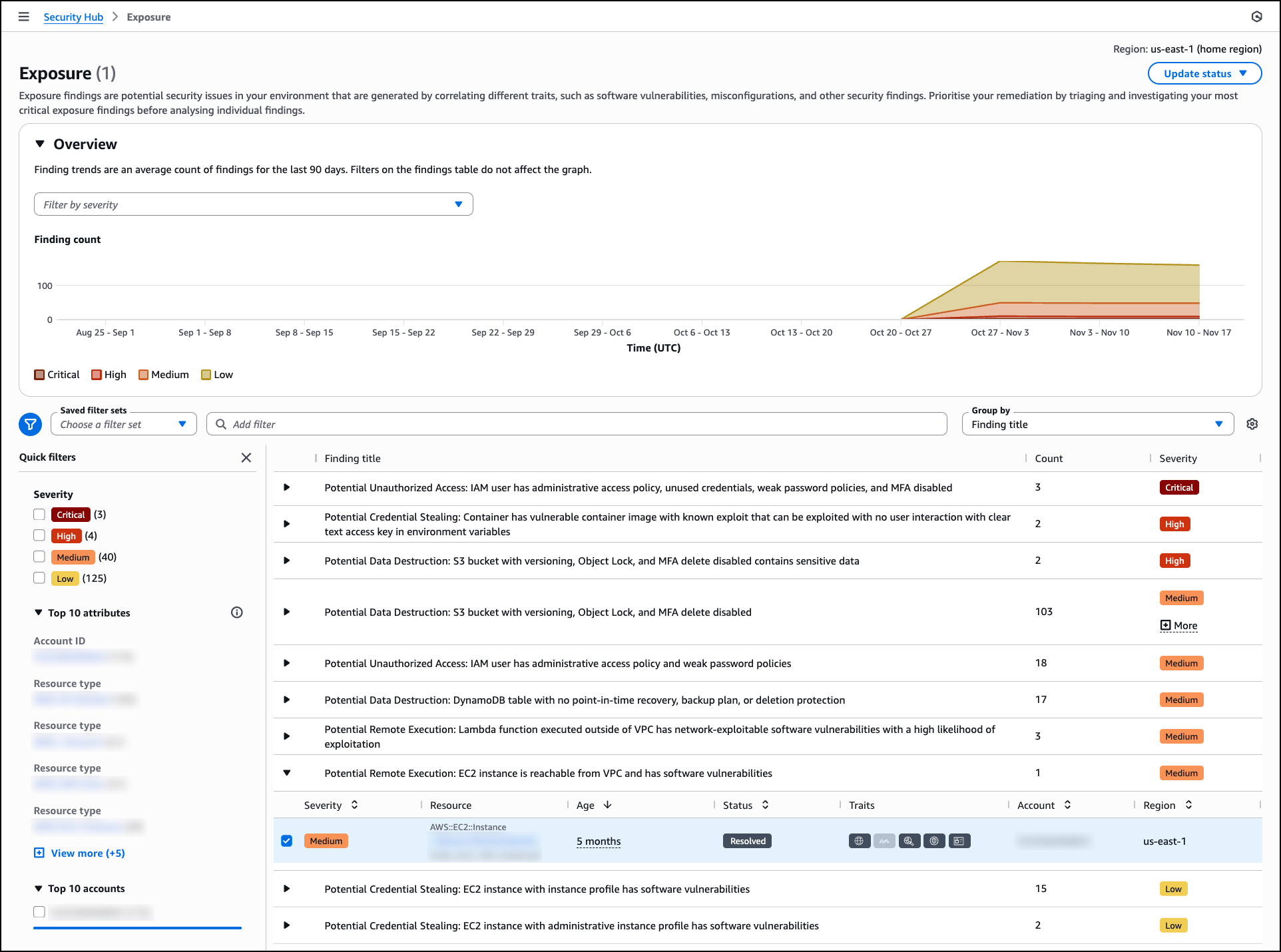 Security Hub now calculates exposures in near real-time and includes threat correlation from GuardDuty alongside existing vulnerability and misconfiguration analysis. When GuardDuty detects threats, Amazon Inspector identifies vulnerabilities, or AWS Security Hub CSPM discovers misconfigurations, Security Hub automatically correlates these findings and updates associated exposures. This advancement provides immediate feedback on your security posture, helping you quickly identify new exposures and verify that remediation actions have reduced risk as expected.