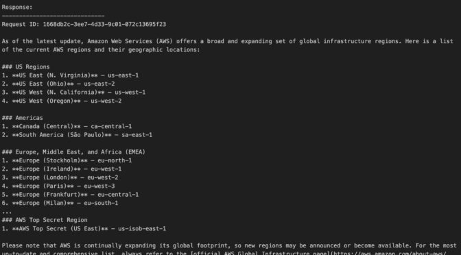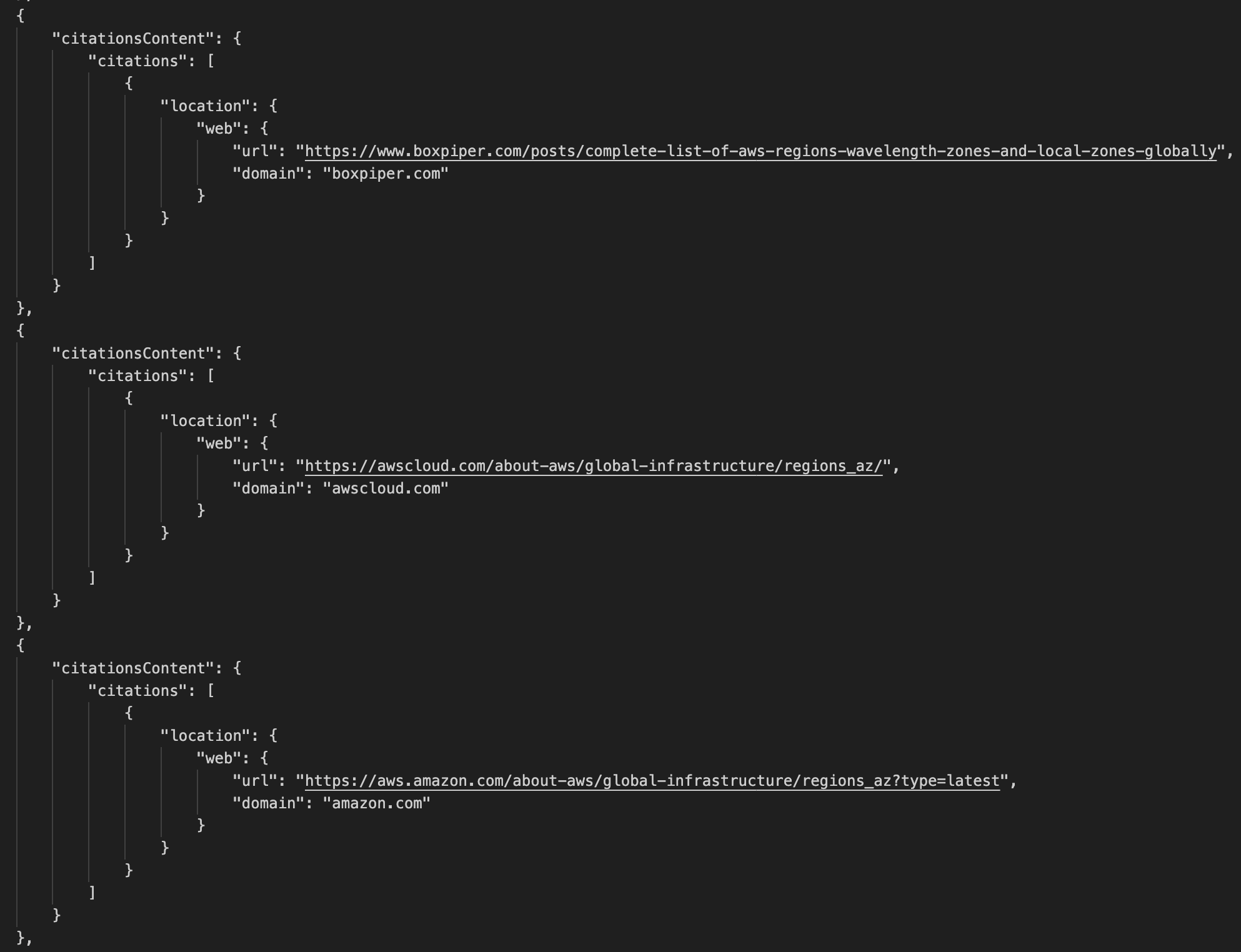 For this demo, I chose the question “What are the current AWS Regions and their locations?” This was selected intentionally because it requires current information, making it useful to demonstrate how Amazon Nova can automatically invoke searches using Web Grounding when it determines that up-to-date knowledge is needed.