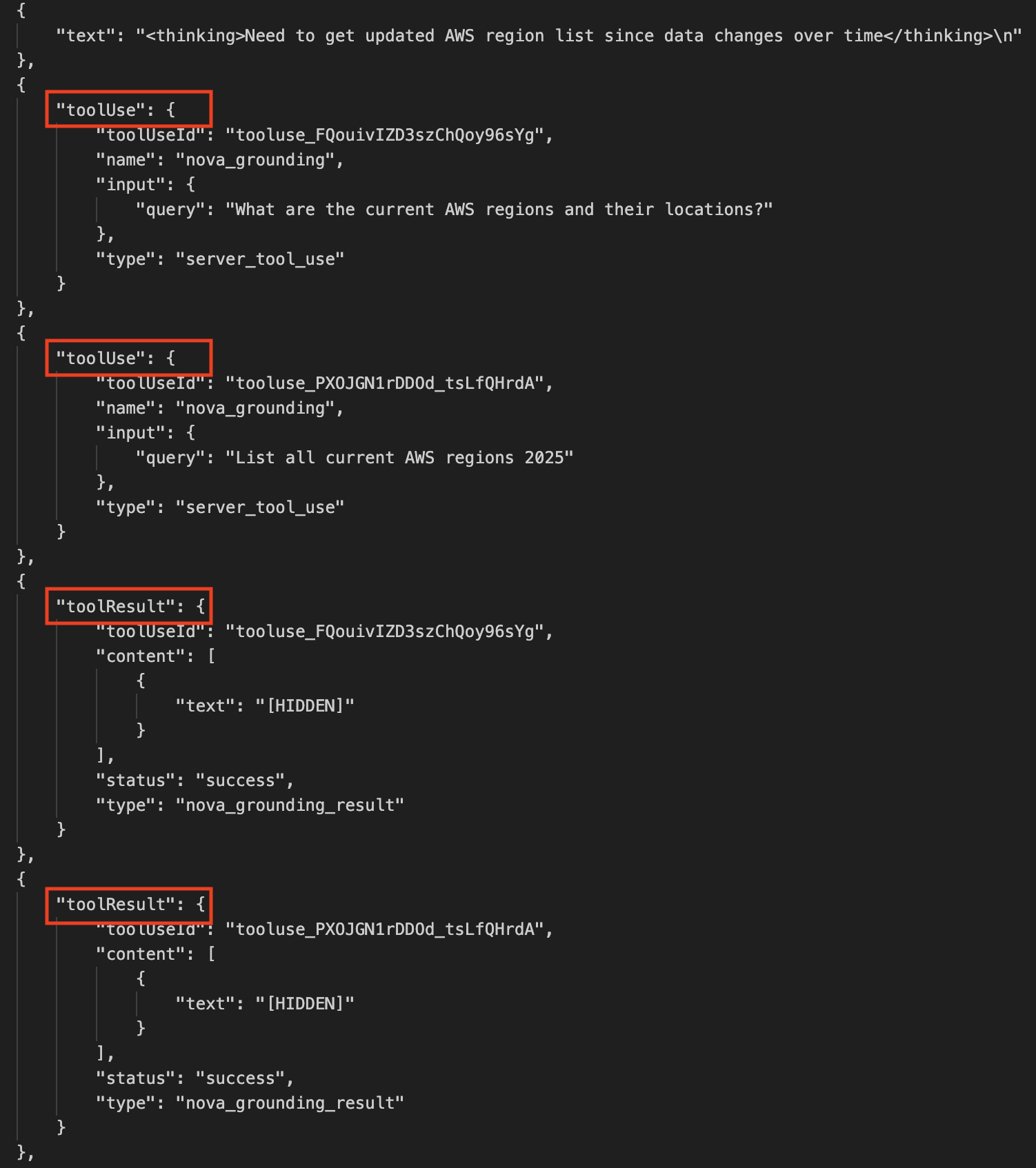 Now let’s use Web Grounding. I make a similar call to the Amazon Bedrock Converse API, but declare nova_grounding as one of the tools available to the model.