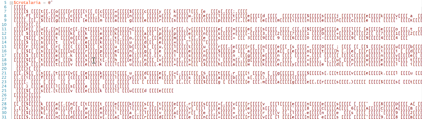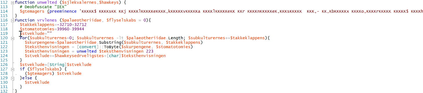 vrvlenes() will deobfuscate strings and, if the second parameter is set to a non-zero value, execute the deobfuscated string with IEX. I decoded all of them, and the following ones give a good understanding of the script.