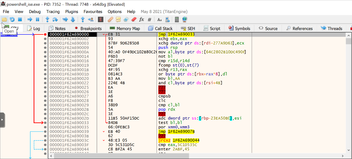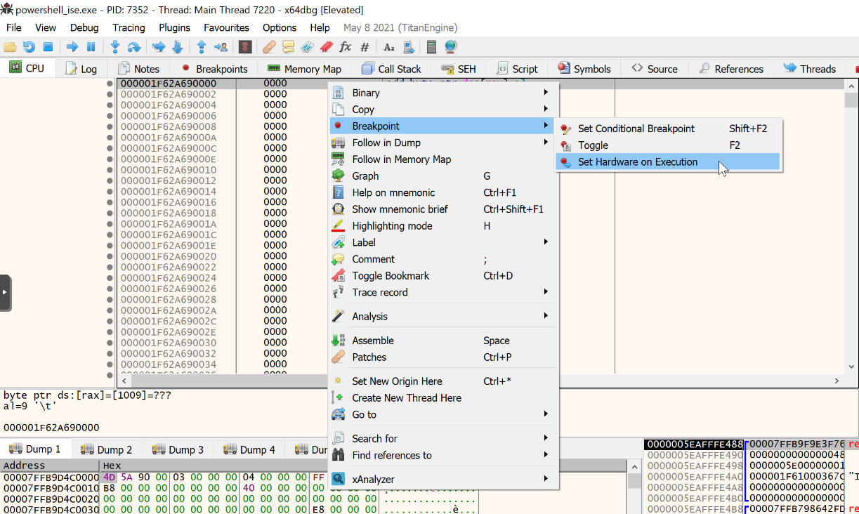 I executed this script in the PowerShell ISE debugger to control it. Once the first memory allocation has been performed, let's attach a debugger to the PowerShell process: