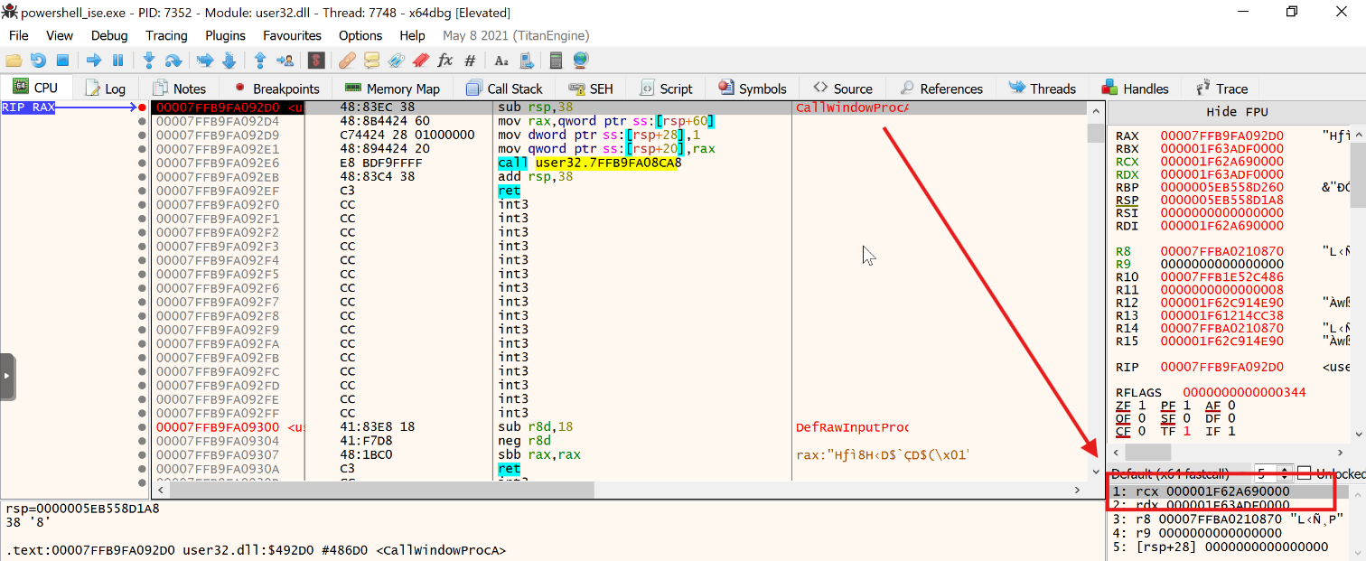 Let's allow PowerShell to invoke CallWindowProcA(), and we get the hardware breakpoint at the beginning of the shellcode: