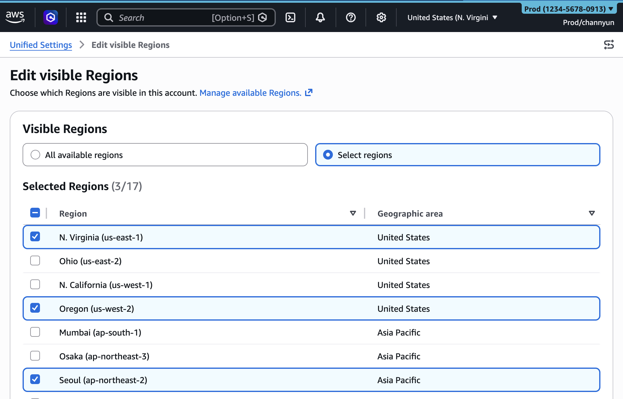 To set visible Regions, choose Edit in the Visible Regions section. Select your visible Regions to All available Regions or Select Regions and configure your list. Choose Save changes.