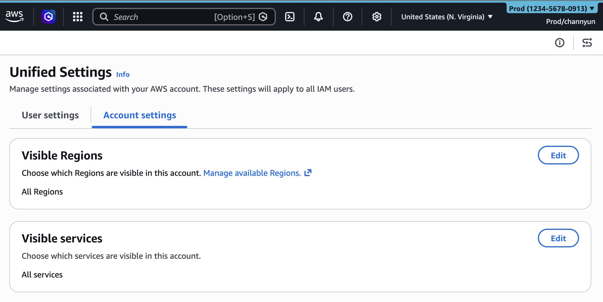 To get started, choose the gear icon on the navigation bar and choose See all user settings. If you are in an administrator role, you can see a new Account settings tab in the unified settings. If you have not configured a setting, all Regions and services are visible.