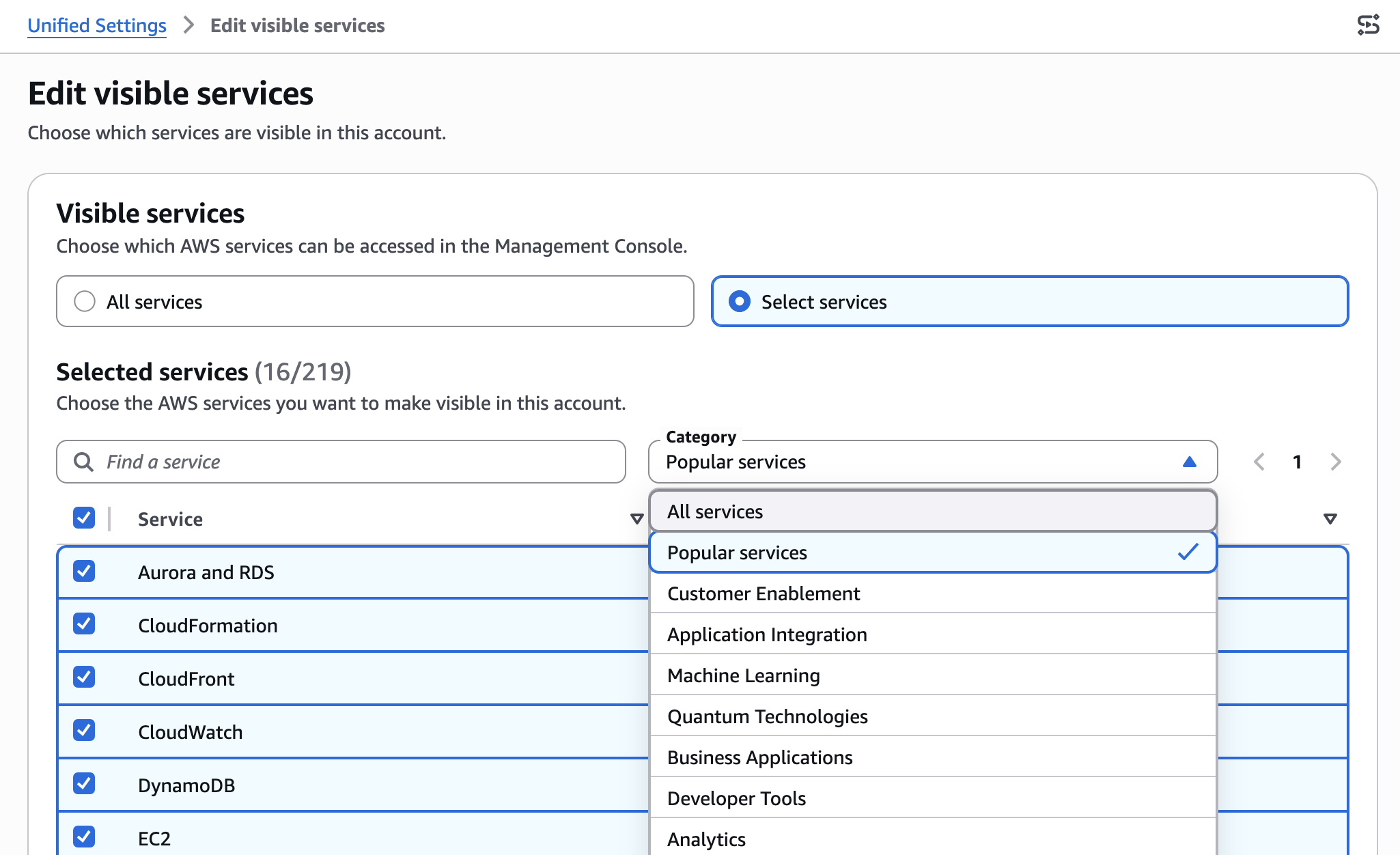 You can control which AWS Regions appear in the Region selector or which AWS services appear in the console navigation. In other words, you can set to show only the Regions and services that are relevant to your account.