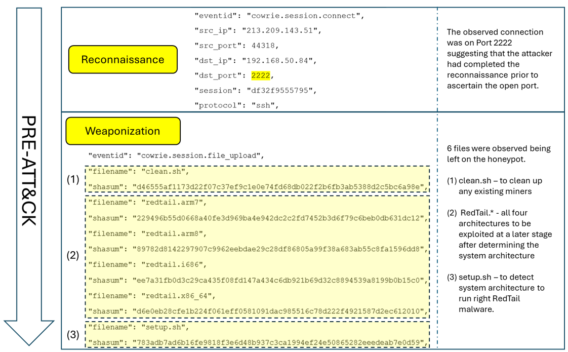 The early phases — reconnaissance and weaponization — may not always appear in logs, but later activity on the honeypot shows the existence of those phases (refer to Figure 2).