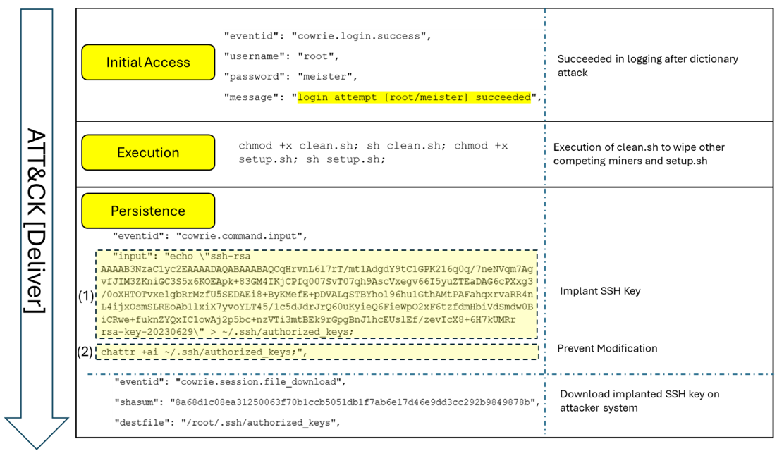 Figure 3: Deliver phase highlighting brute-forced SSH access, script execution, and persistence methods)