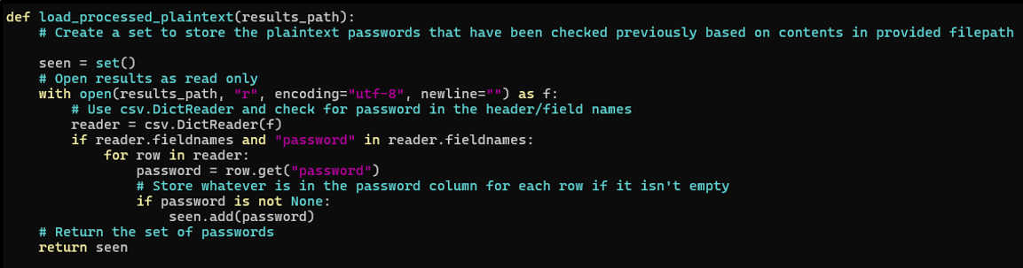 In Figure 1, we can see the section of code that handles reading the results file that includes all passwords we have searched for. This is expected to be formatted as a CSV file with a header of “password,sha1,count