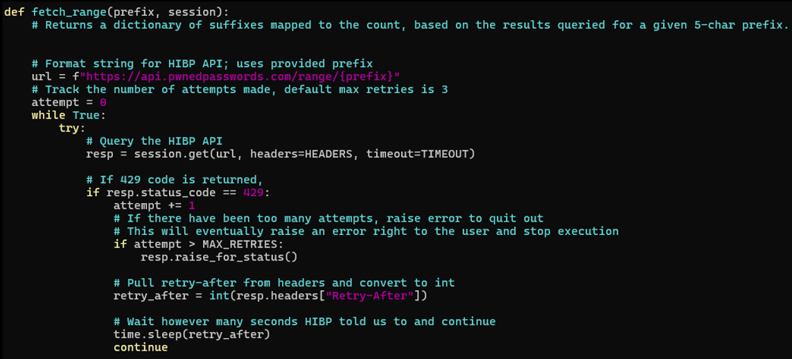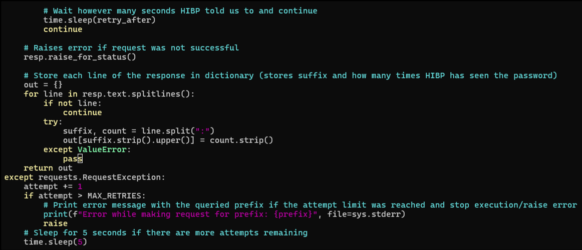 ” is called which would raise an exception if there were an error with the HTTP request. If there’s no error, we simply iterate through all lines of the response to save the hash suffix and count in a dictionary, then return it. If an exception is raised, we increment an “attempt