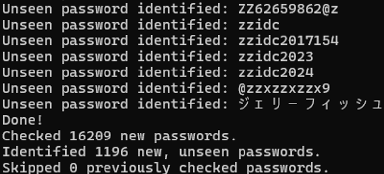 As the script runs, it will print out each unseen password identified and a short summary at the end as seen in Figure 4.
