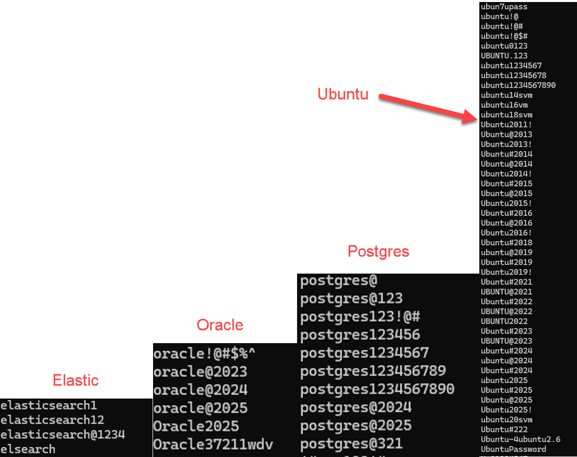 Looking through the unseen passwords, we can also see more specific targets such as Elasticsearch, Oracle, PostgresSQL, and Ubuntu. Figure 5 shows some of these passwords, which use the same kind of modifications mentioned earlier, and illustrate the relative difference in frequency.