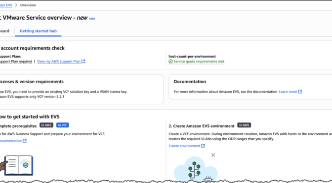 Today, we’re announcing the general availability of Amazon Elastic VMware Service (Amazon EVS), a new AWS service that lets you run VMware Cloud Foundation (VCF) environments directly within your Amazon Virtual Private Cloud (Amazon VPC). With Amazon EVS, you can deploy fully functional VCF environments in just hours using a guided workflow, while running your VMware workloads on qualified Amazon Elastic Compute Cloud (Amazon EC2) bare metal instances and seamlessly integrating with AWS services such as Amazon FSx for NetApp ONTAP.