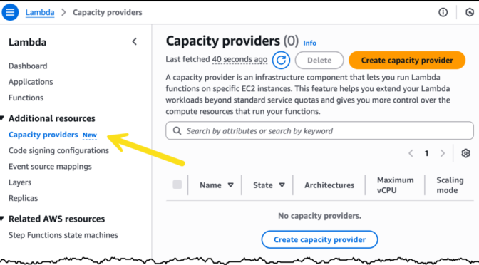 To take Lambda Managed Instances for a spin, I first need to create a Capacity provider. As shown in the following image, there is a new tab for creating these in the navigation pane under Additional resources.