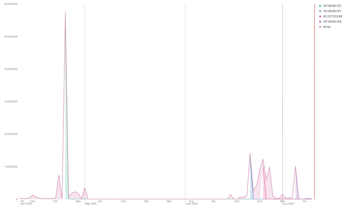 Digging into the source of this anomaly, I filtered for traffic by day and found that there were massive spikes on just a few days in the last three months that accounted for most of the DShield sensor's captured volume.