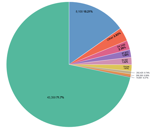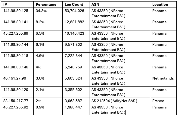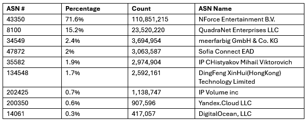 Autonomous System Numbers (ASN) 43350 accounted for 71.6% of the total sensor logs! This ASN belonging to NForce Entertainment but NForce Entertainment appears to often lease out its IP space to other VPN and proxy providers like the Panama based Flyservers S.A. Flyservers is categorized as a "potentially very high fraud risk ISP" by Scamalytics and is likely the source of this activity.