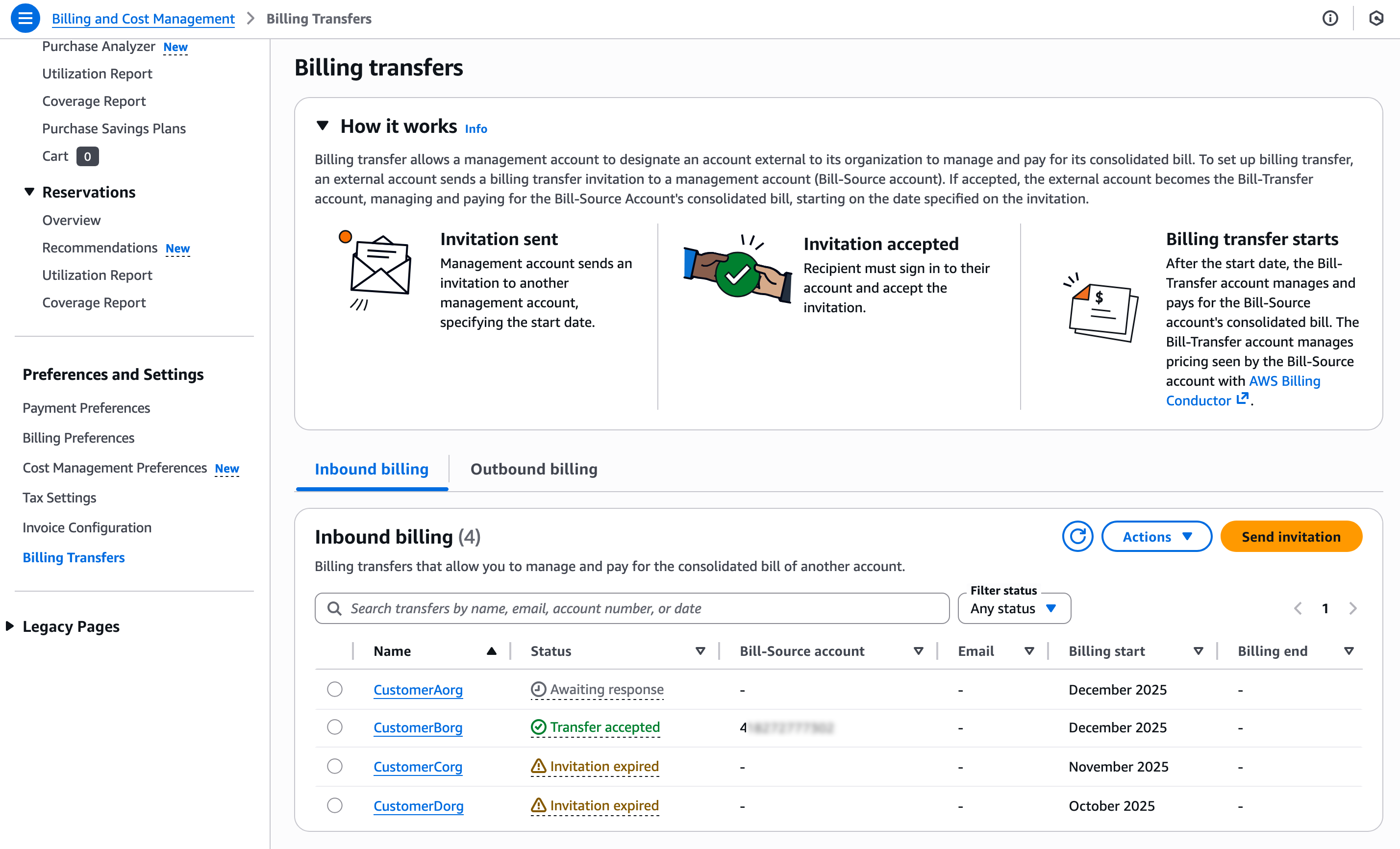 To set up Billing Transfer, an external management account sends a billing transfer invitation to a management account called a bill-source account. If accepted, the external account becomes the bill-transfer account, managing and paying for the bill-source account’s consolidated bill, starting on the date specified on the invitation.