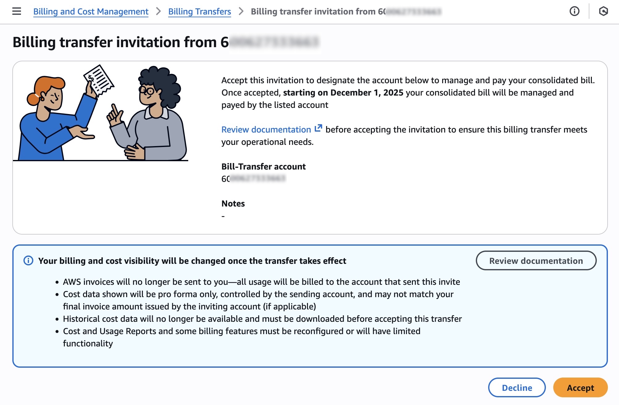 To learn more about details, visit Billing Transfer in the AWS documentation.