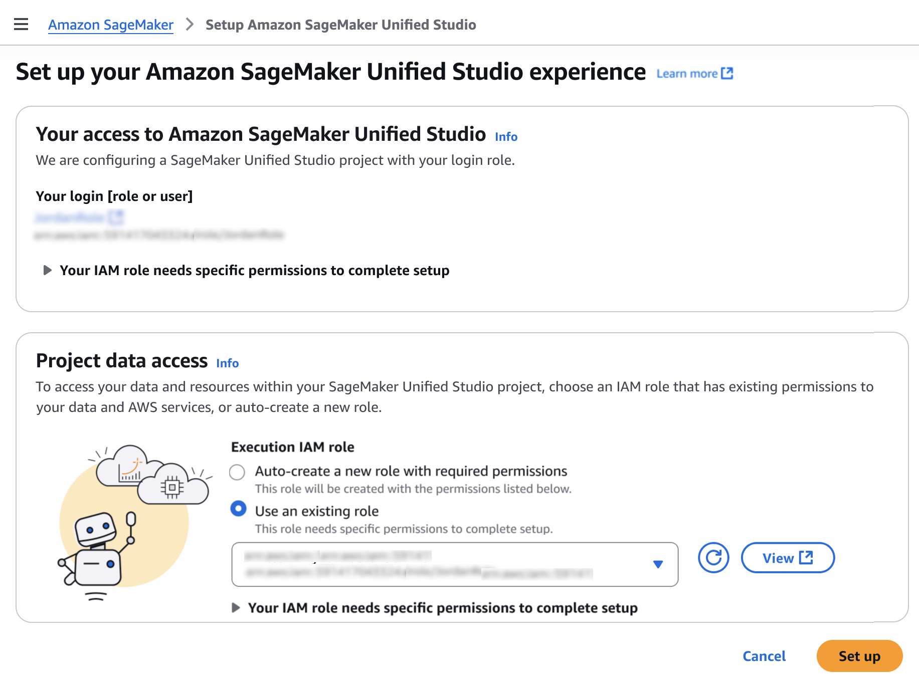 You will be prompted either to select an existing AWS Identity and Access Management (AWS IAM) role that has access to your data and compute, or to create a new role.
