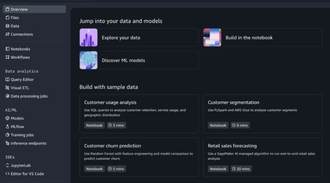 Amazon SageMaker is introducing a new notebook experience that provides data and AI teams with a high-performance, serverless programming environment for analytics and ML jobs. The new notebook experience includes Amazon SageMaker Data Agent, a built-in AI agent that accelerates development by generating code and SQL statements from natural language prompts while guiding users through their tasks.