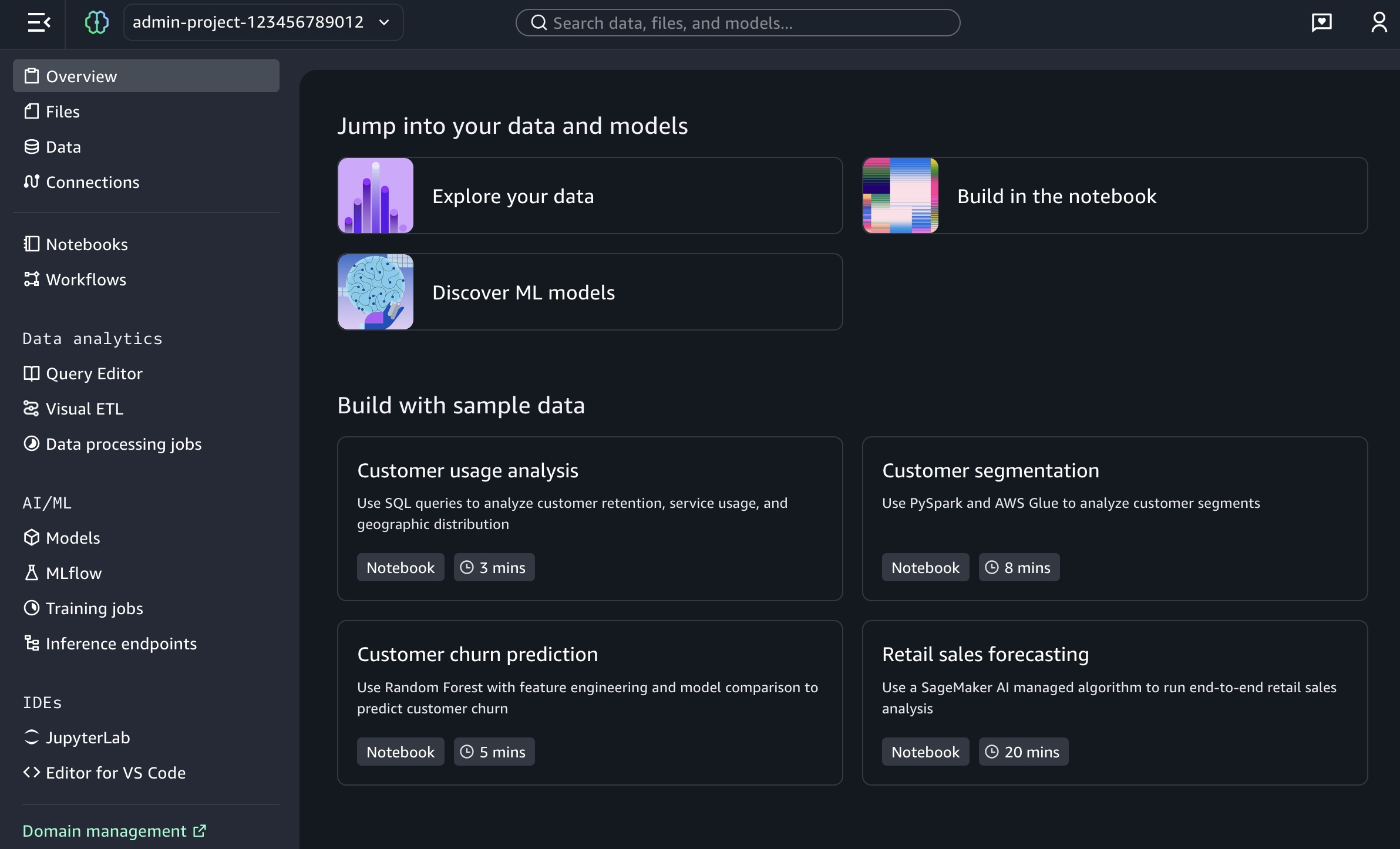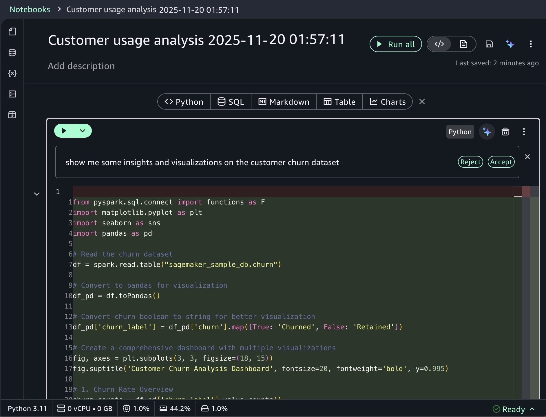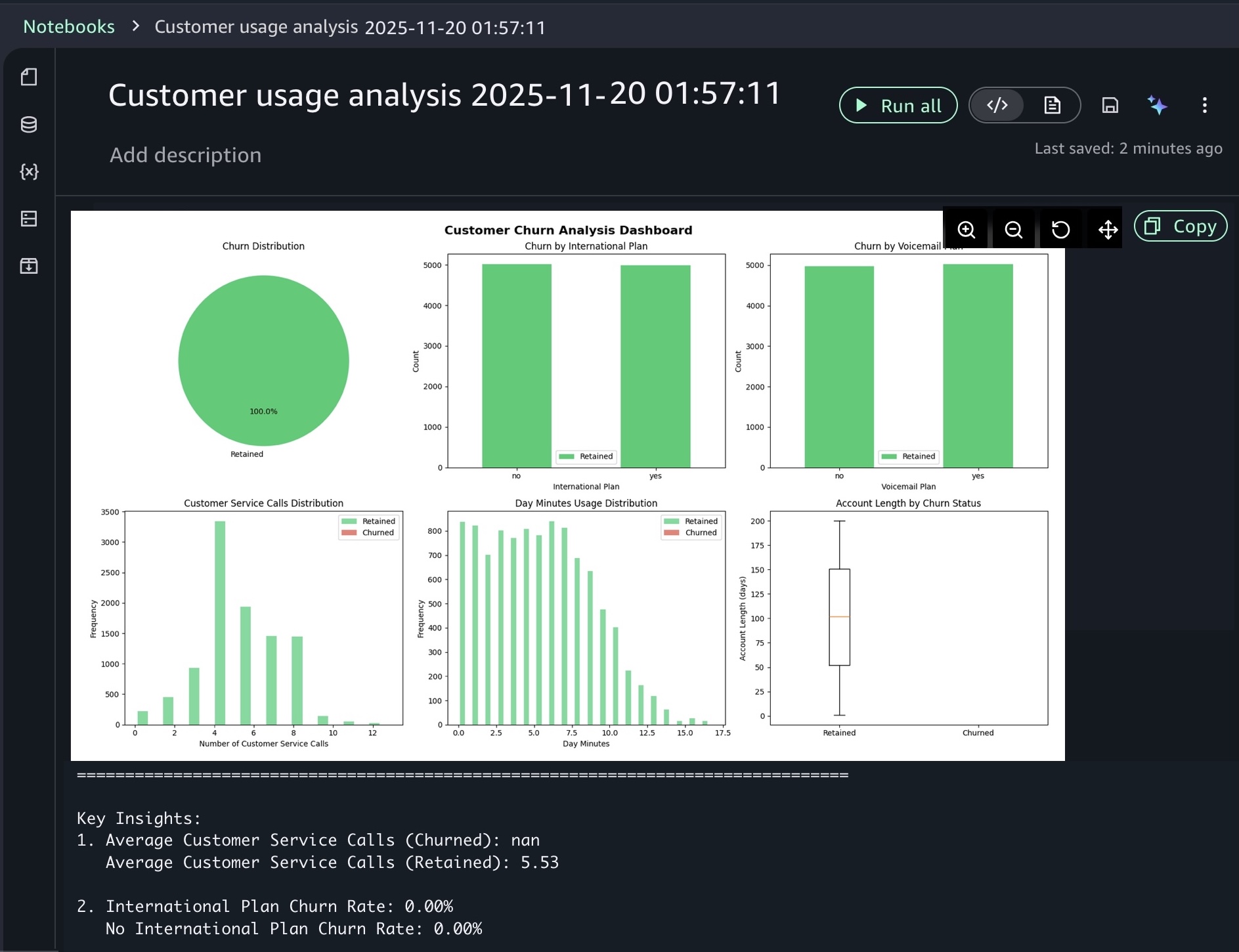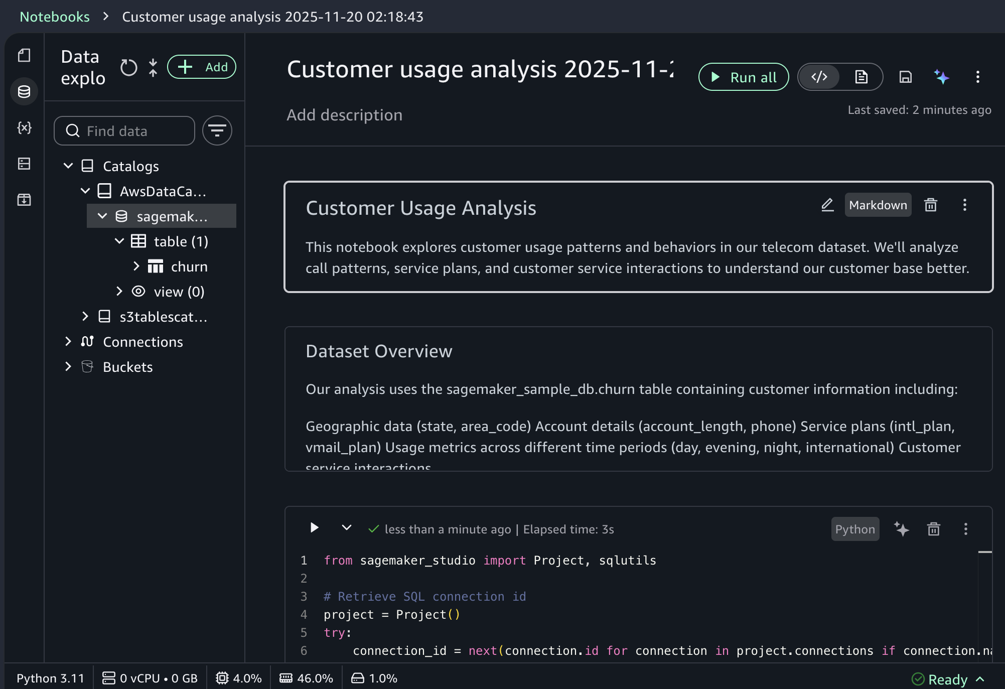 When you choose a sample project for customer usage analysis, you can open sample notebook to explore customer usage patterns and behaviors in a telecom dataset.