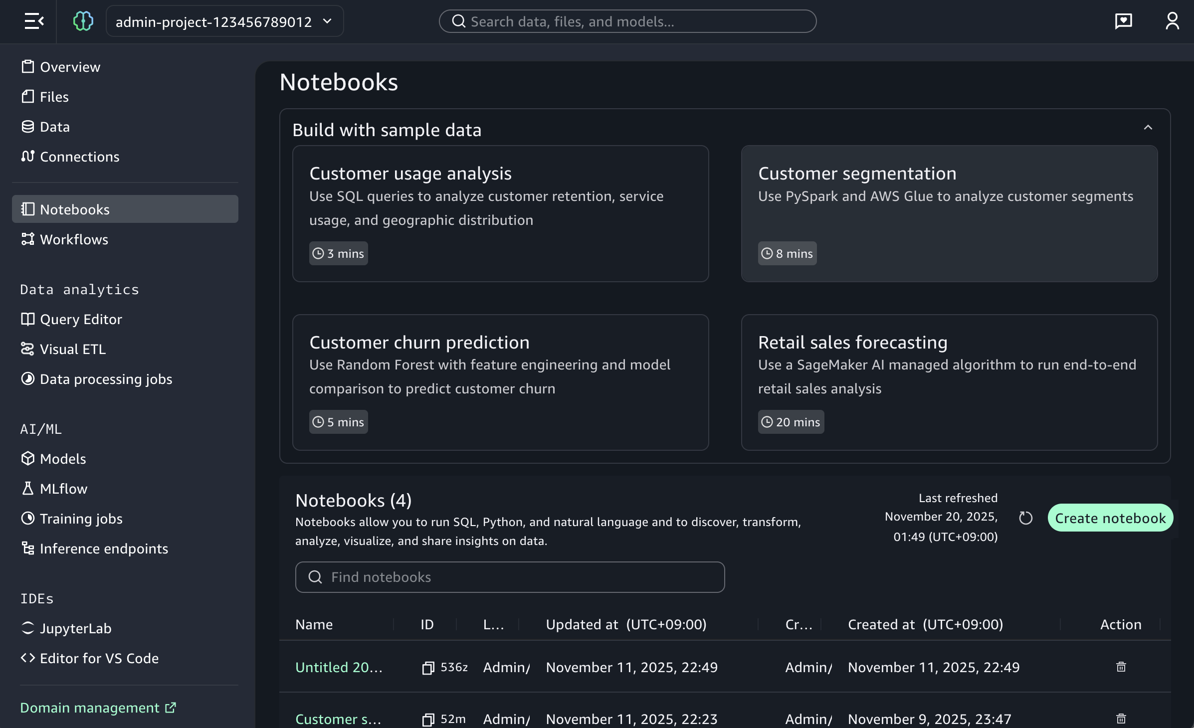 To start a new notebook, choose the Notebooks menu in the left navigation pane to run SQL queries, Python code, and natural language, and to discover, transform, analyze, visualize, and share insights on data. You can get started with sample data such as customer analytics and retail sales forecasting.