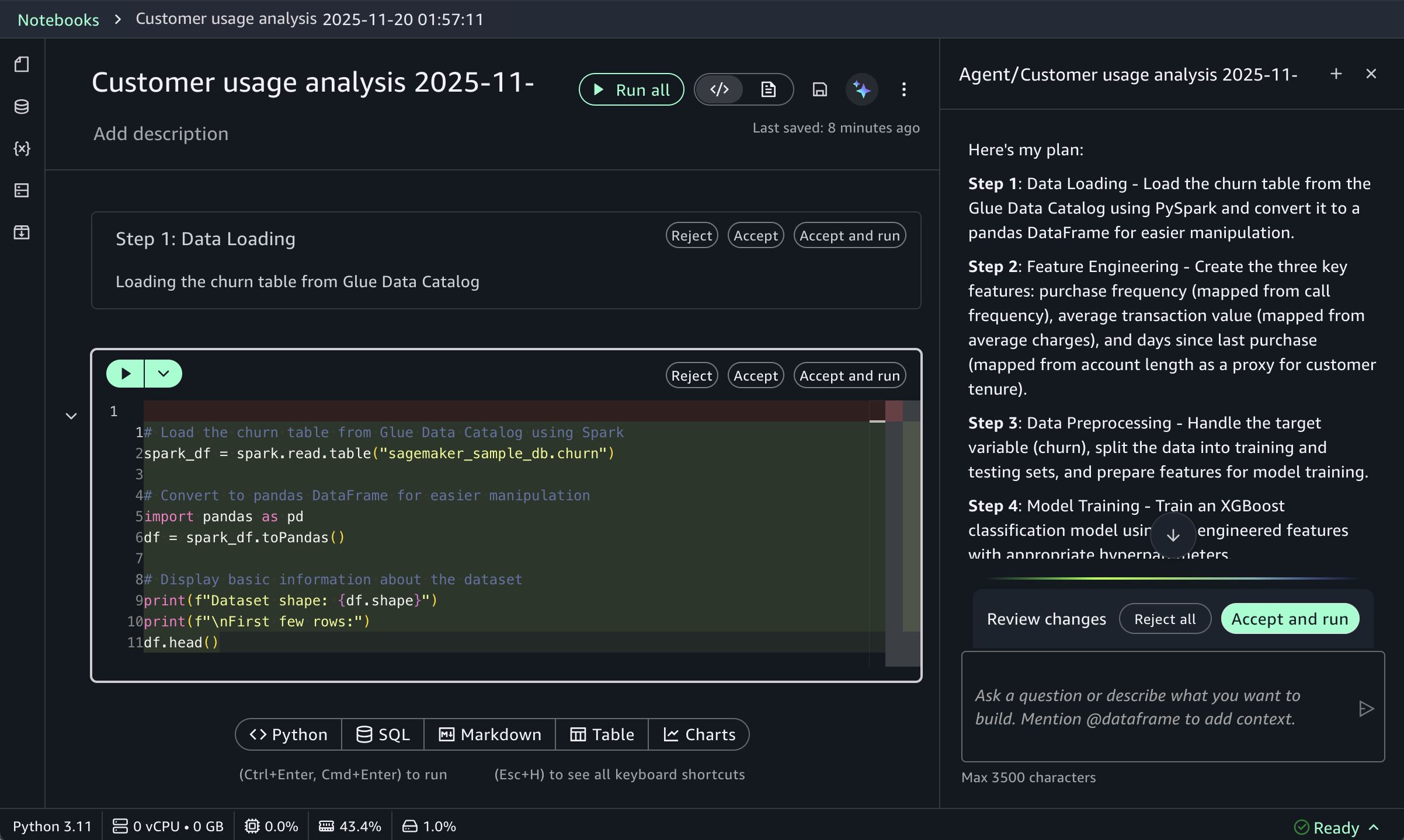 This prompt receives structured responses including a step-by-step plan, data loading, feature engineering, and model training code using the SageMaker AI capabilities, and evaluation metrics. SageMaker Data Agent works best with specific prompts and is optimized for AWS data processing services including Athena for Apache Spark and SageMaker AI.