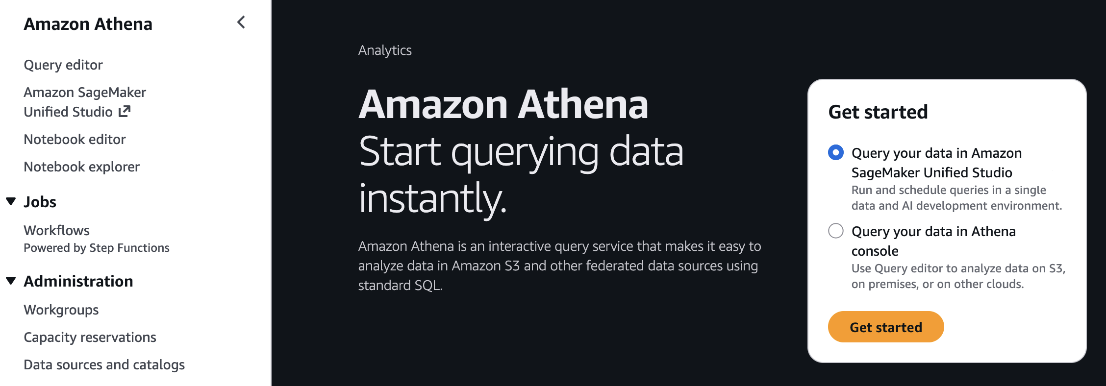 You can also get started working on specific tables in Amazon Athena, Amazon Redshift, and Amazon S3 Tables. For example, you can select Query your data in Amazon SageMaker Unified Studio and then choose Get started in Amazon Athena console.
